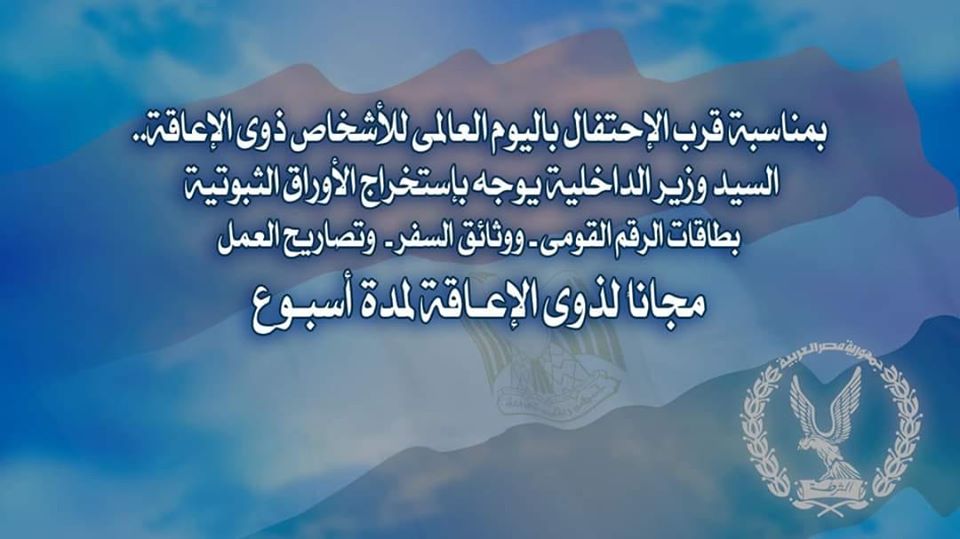 فقد وجه السيد/ وزير الداخلية بإستخراج الأوراق الثبوتية بطاقات الرقم القومى ووثائق السفر وتصاريح العمل لذوى الإعاقة مجاناً (لمدة أسبوع) إعتباراً من يوم الثلاثاء الموافق 3/12/2019.