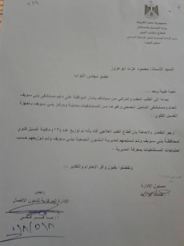 فقد أكد النائب محمود عزت ابو عزوز عضو مجلس النواب عن دائرة مركز وبندر بنى سويف عن تلقيه خطاب من الإدارة المركزية لشئون الاتصال السياسي بوزارة الصحة والسكان يفيد بتوزيع عدد 13 ماكينة غسيل كلوى لمحافظة بنى سويف وتم تسليمهم لمديرية الشئون الصحية وتم توزيعهم حسب احتياجات المستشفيات بمعرفة المديرية .