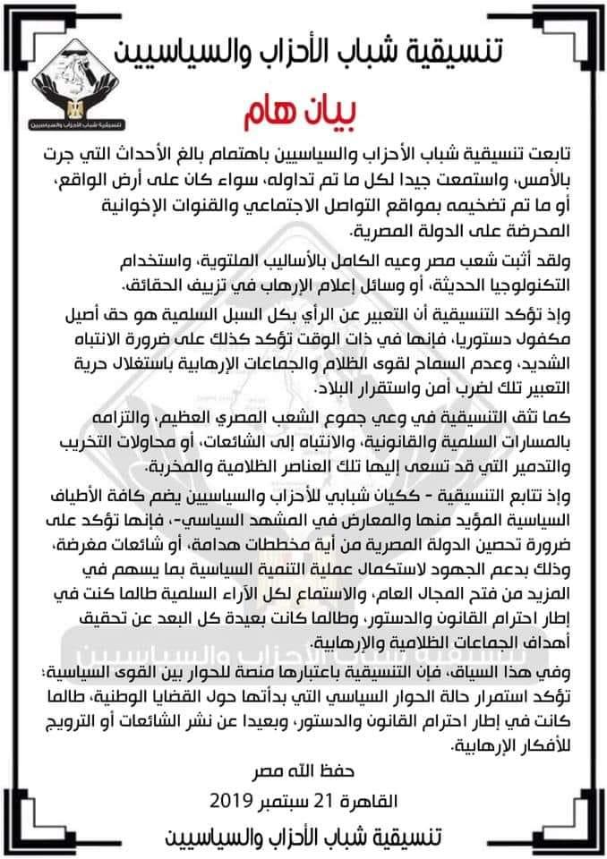 تابعت تنسيقية شباب الأحزاب والسياسيين باهتمام بالغ الأحداث التي جرت بالأمس، واستمعت جيدا لكل ما تم تداوله، سواء كان على أرض الواقع أو ما تم تضخيمه بمواقع التواصل الإجتماعي والقنوات الإخوانية المحرضة علي الدولة المصرية.