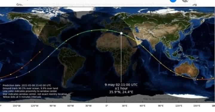 صرح ا.د / جاد القاضى رئيس المعهد القومى للبحوث الفلكية والجيوفيزيقية انه في إطار جهود الرصد والمتابعة للدخول الغير منضبط للصاروخ الصيني CZ-5B (Long March 5B) الغلاف الجوي. فمن المتوقع دخول الصاروخ الغلاف الجوي للأرض خلال الفترة من الساعة الثالثة و12 دقيقة إلي الساعة الخامسة و11 دقيقة من فجر يوم 9 مايو 2021 بتوقيت القاهرة في نطاق المدار الموضح في الخريطة المرفقة والذي يمر90% منه فوق المياه ابتداءا من فوق شمال المحيط الأطلنطي ويمتد جنوب أسبانيا ويمر بالبحر المتوسط شمال السواحل المصرية ويمتد شرقا إلي الأردن والجزيرة العربية والمحيط الهندي وصولا للسواحل الأسترالية. ومن المتوقع عند دخوله الغلاف الجوي أن يتعرض لدرجة حرارة مرتفعة نظرا للاحتكاك مع جزيئات الغلاف الجوي مما يمكن أن يتسبب في انفجاره واحتراقه علي أرتفاع من 35-45 كم في طبقة الأستراتوسفير من الغلاف الجوي وقد يصل بعض الشظايا مختلفة الأحجام إلي سطح الأرض ومن المستبعد سقوط أجزاء من الصاروخ علي الأراضي المصرية المأهولة بالسكان والغرفة مستمرة في أعمال الرصد والتحليل للمدار وسيتم أصدار بيانات تاليه علي مدار الساعات القادمة كلما توفر معلومات أو بيانات جديدة