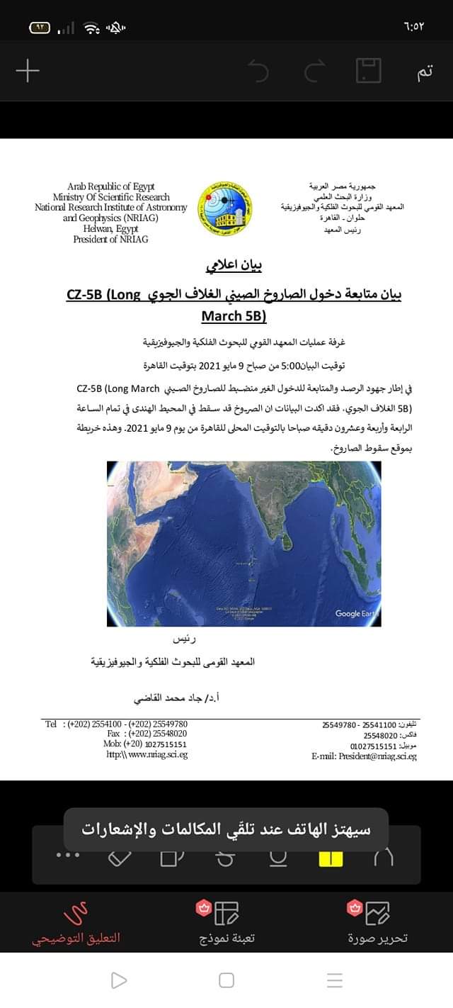 بيان من المعهد القومى للعلوم الفلكيه والجيوفيزيقيه حول سقوط الصاروخ الصينى بالمحيط الهندى .