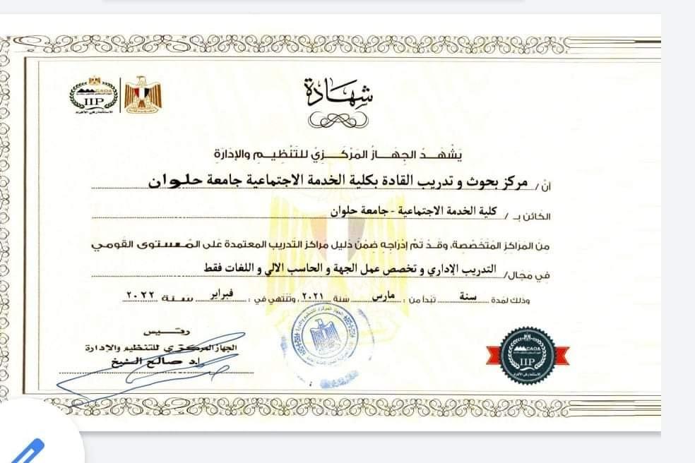 تحت رعاية الأستاذ الدكتور ماجد نجم رئيس جامعة حلوان، وريادة الأستاذ الدكتور حسام رفاعى نائب رئيس الجامعة، تم تجديد اعتماد مركز بحوث وتدريب القاده بكلية الخدمة الاجتماعية جامعة حلوان على المستوى القومي من الجهاز المركزي للتنظيم والإدارة في مجالات التدريب المتعددة (الإداري،اللغات ، الحاسب الآلي، مجالات تخصص الكلية) ويعد مركز متخصص فى تدريب القادة بمصر، يأتي ذلك كأول مركز على مستوى الجامعات المصرية يحصل على تجديد الاعتماد منذ تعرض البلاد لجائحة كورونا.