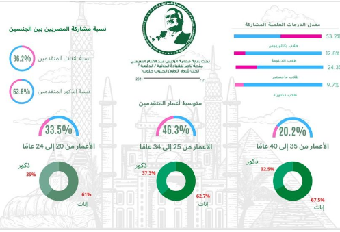 حيث جاءت إحصائية من قاموا بالتسجيل للمشاركة في الدفعة الثانية من منحة " ناصر للقيادة الدولية " 774 شخص من الجنسين بلغت فيهم نسبة الذكور حوالي 63.8% بينما بلغت الإناث حوالي 36.2%، ومتوسط أعمارهم يقع في الفئة العمرية من 25 إلي 34 سنة بحوالي 46.3% من بينهم 62.7 من الإناث 37.3% من الذكور من جملتهم، والفئة العمرية من 20 إلي 24 سنة بنسبة بلغت حوالي 33.5% من بينهم 61% من الإناث و 39 % من الذكور، فيما بلغت نسبة أولئك الذين تقع أعمارهم من 35 إلي 40 سنة حوالي 20.2% فقط من إجمالي عدد المتقدمين من بينهم 67.5% من الإناث و32.5% من الذكور.