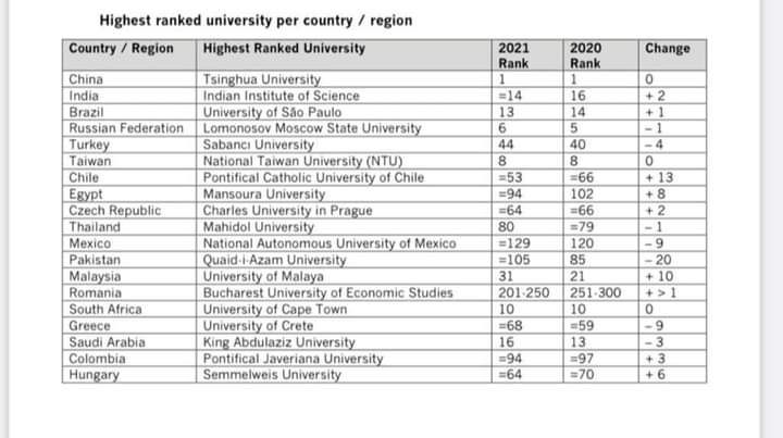 حيث صنفت جامعة المنصورة وهى الجامعة المصرية الوحيدة في الترتيب العالمي ضمن أفضل 100 جامعة على مستوى العالم و قد حافظت جامعة المنصورة علي تميزها وصدارتها محليا و تقدمت عالميا ٨ مراكز لتصبح في المركز الي ٩٤ في ٢٠٢١ بدلا من ١٠٢ في عام ٢٠٢٠ م كما احتلت الجامعة المركز الأول على مستوى الجامعات المصرية للعام الثالث على التوالي.