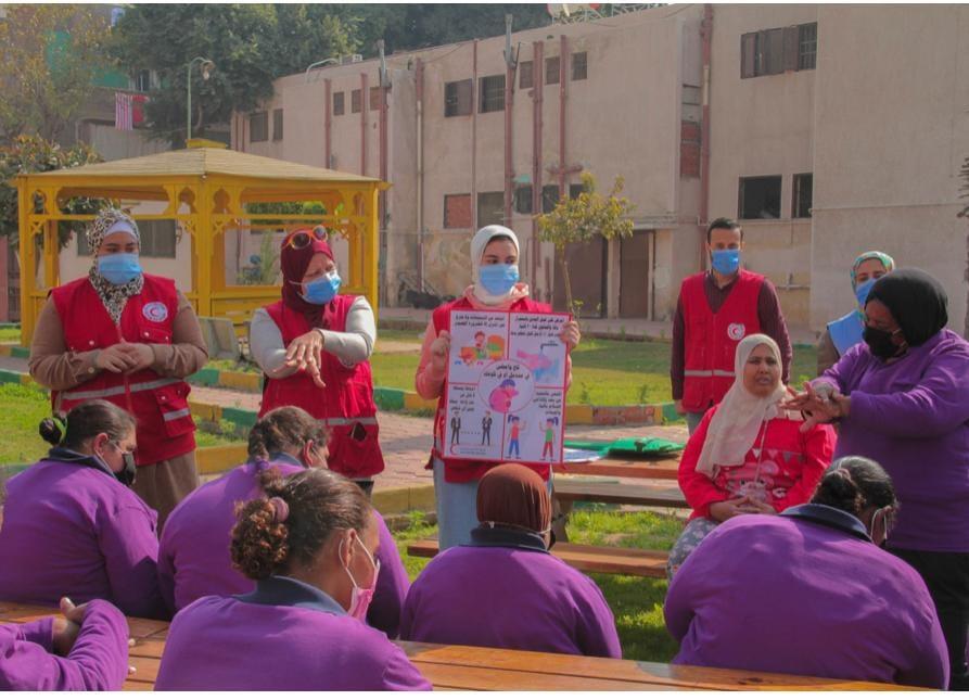 قام متطوعو جمعية الهلال الأحمر المصري ، المسلحين بشكل ملائم بالأقنعة والدروع البلاستيكية والقفازات، بتنظيم دروسًا خاصة لتعليم الأطفال والكبار أساسيات النظافة الشخصية والتباعد الاجتماعي. قام أخصائيون من جمعية الهلال الأحمر المصري بتعقيم مرافق ومعدات المعيشة عند الضرورة.