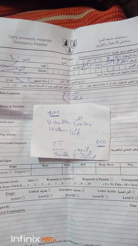 وتضيف: "عند وصولي مستشفى الهرم اقروا بعملية جراحية وطلبوا مني 20الف جنيه للعملية وعلي نفقتي الخاصة وانا ما كان معي فلوس لانوا سرقوا كل ما أملك وذهبت إلى مستشفي القصر العيني أبلغوني بأن ميعاد العملية بعد شهر ولكن لصعوبة حالتي الصحية جراء الحادثة ابلغت النائب عبد الرحيم علي نائب عن دائره الدقي وتم التدخل من طرفه وتم اجراء العمليه لي في القصر العيني".
