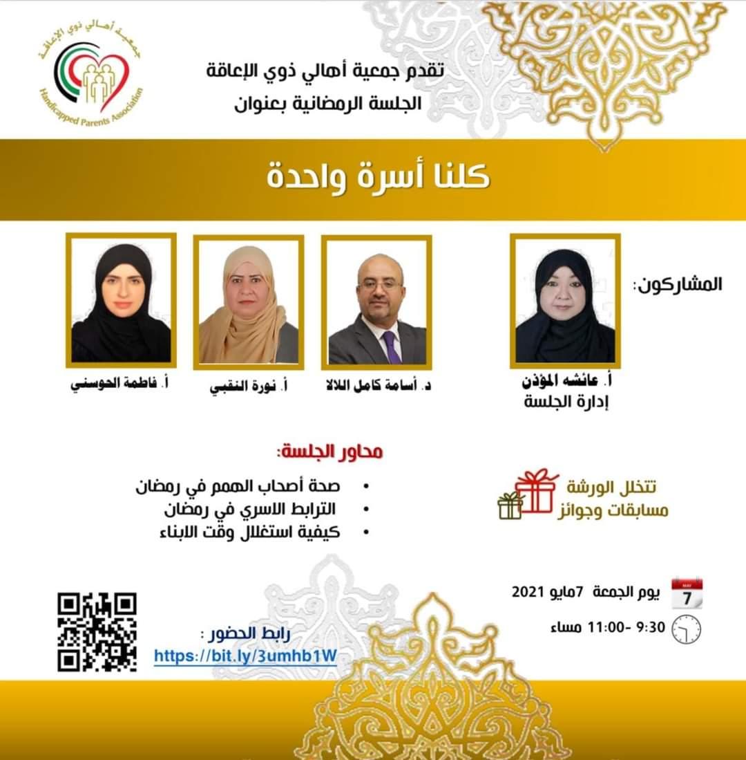 بمناسبة حلول شهر رمضان المبارك أعادة الله علينا بالخير والبركة نفذت جمعية أهالي ذوي الاعاقة ضمن سلسلة من البرامج الرمضانية (المجلس الرمضاني) وهو لقاء إفتراضي عبر منصة الزووم نتيجة لظروف الراهنة من جانحة كرونا (كوفيد19)