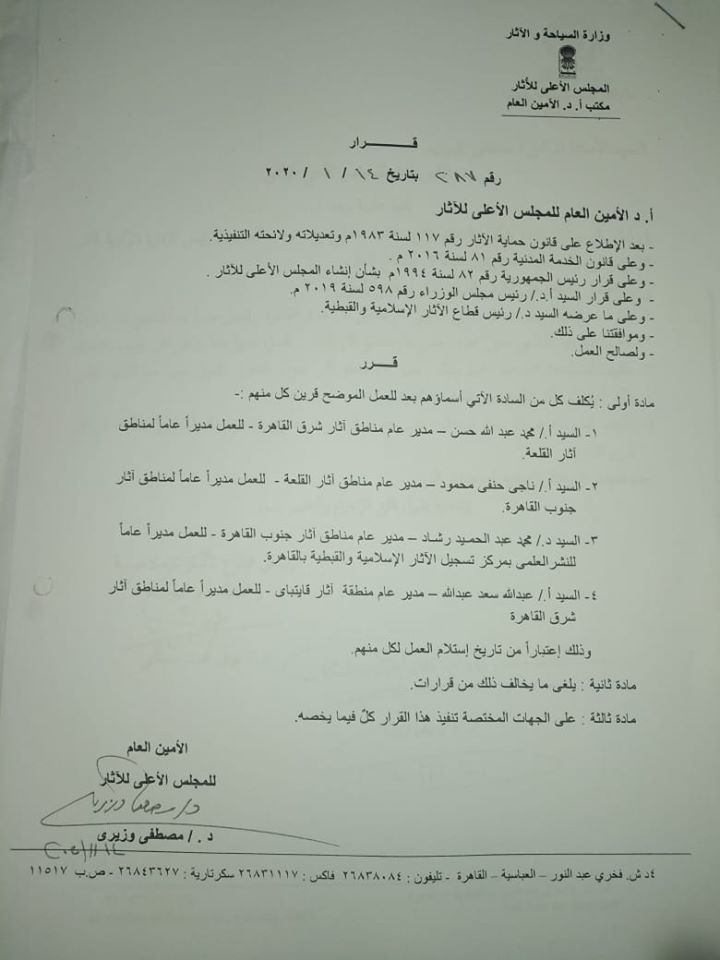 فى إطار الدفع بالفيادات المتميزة بقطاع الآثار الاسلاميه والقبطية واليهودية لتولى مناصب ذات طابع مختلف لاكتساب الخبرات الإدارية والميدانيه تم تكليف مجموعه من قيادات الصف الأول والصف الثانى من الاثاريين لتولى إدارة بعض المناطق الهامه بالقطاع