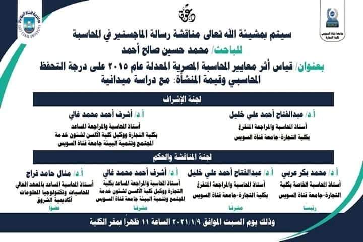 وكانت الرسالة المقدمة بعنوان / قياس أثر معايير المحاسبة المصرية المعدلة عام 2015 على درجة التحفظ المحاسبي وقيمة المنشأة ( دراسة ميدانية ) وذلك اليوم السبت 9 يناير 2021