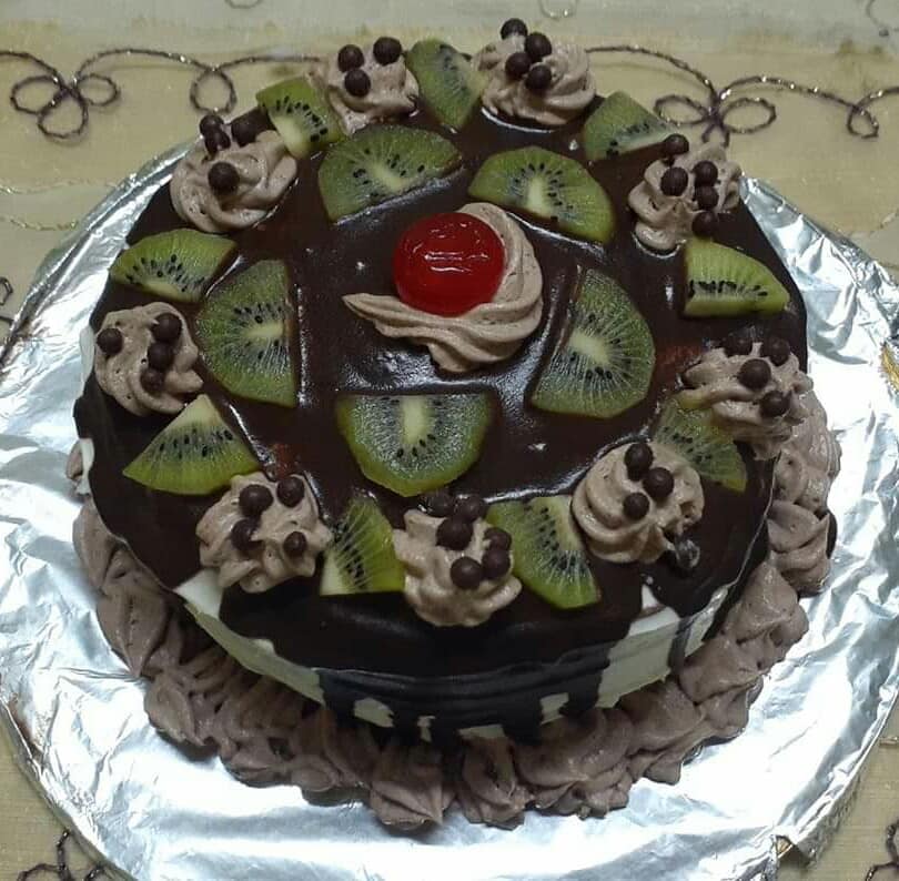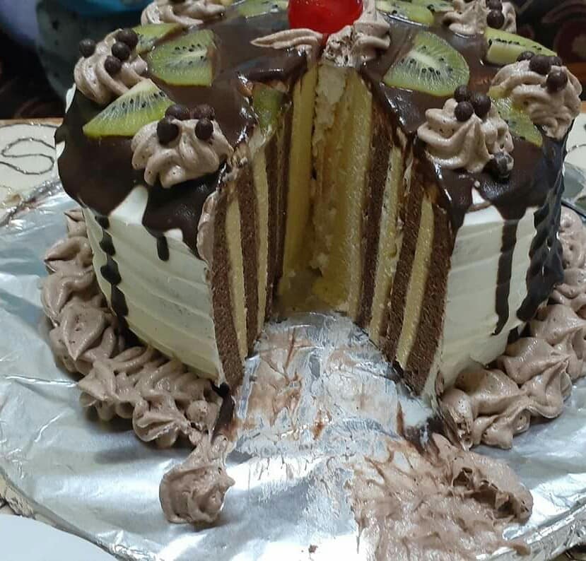 نقطع الكيك الى اربع قطع متساويين نضع ورق استرتش علي طبق ونبتدى نضع الكريم شانتيه على الكيك ونلفه على شكل رول