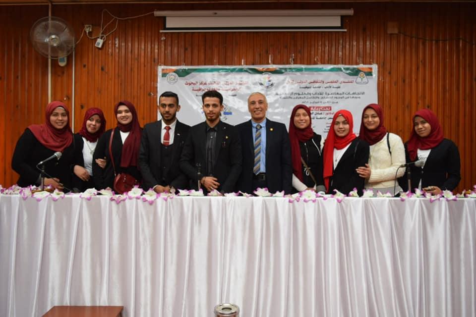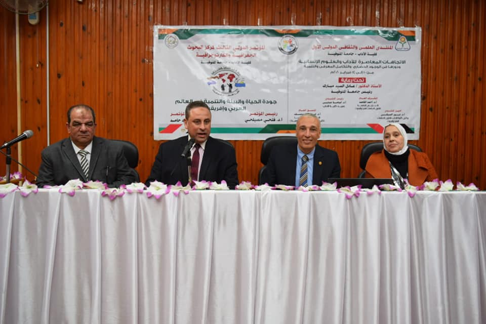 عقد المنتدى العلمي والثقافي الدولي الأول بآداب المنوفية جامعة المنوفية ( الاتجاهات المعاصرة للآداب والعلوم الإنسانية ودورها في الوجود الحضاري والتكامل المعرفي والتنمية ) برئاسة الدكتور أسامة مدني عميد الكلية وأمين المنتدي الدكتور نور السبكى ومنسق المنتدي الدكتور إسماعيل يوسف ، الجلسة الختامية للمؤتمر بحضور الدكتورة ايملي حمادة والدكتور حسن خطاب وكيلا الكلية والوفود العربية والاجنبية المشاركة بالمنتدي.