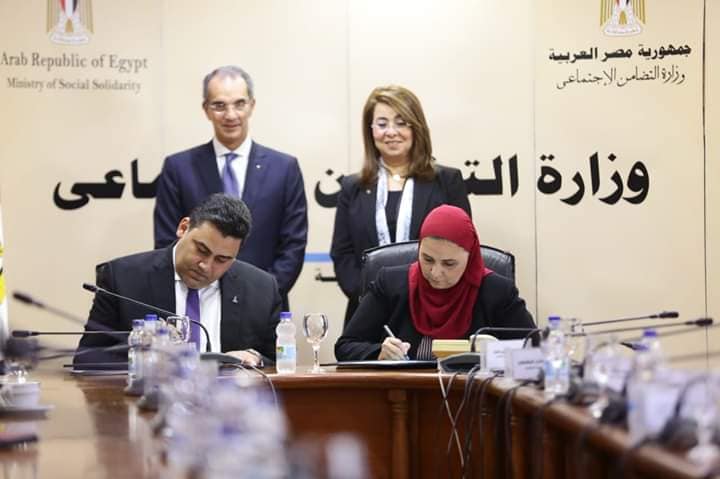 وقع البروتوكول الأستاذة نيفين القباج نائب وزير التضامن الاجتماعي والمهندس عادل حامد العضو المنتدب والرئيس التنفيذي للشركة المصرية للاتصالات.