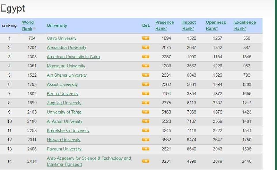 وتابع الخشت، أن جامعة القاهرة جاءت في صدارة الجامعات المصرية في تصنيف (CWUR) لعام 2018 واحتلت المرتبة 452 من بين أكثر من 1000 جامعة على مستوي العالم في هذا التصنيف، لافتاً إلي أن الجامعة احتفظت بمكانتها ضمن أفضل جامعة في التصنيف الصيني في الفئة 401 إلى 500.