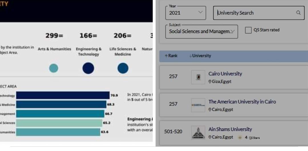 أعلن الدكتور محمد عثمان الخشت رئيس جامعة القاهرة، تحقيق قفزة غير مسبوقة في التصنيف الإنجليزي (QS) لأفضل الجامعات في مجالات العلوم الإنسانية والآداب والعلوم الإجتماعية والإدارية، حيث جاءت الجامعة ضمن أفضل 300 جامعة عالمية راقية ، ومن بين 1% من الجامعات التي تم اختيارها وتصنيفها من بين أكثر من 30 ألف جامعة في العالم، بالإضافة إلى احتفاظها بصدارة الجامعات المصرية.