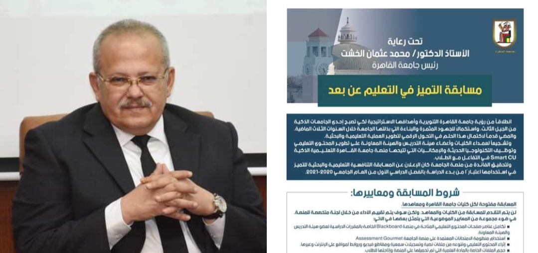 أعلن الدكتور محمد عثمان الخشت رئيس جامعة القاهرة، عن إطلاق مسابقة "التميز في التعليم عن بُعد" لتشجيع عمداء الكليات وأعضاء هيئة التدريس والهيئة المعاونة على استخدام المنصة التعليمية الذكية للجامعة Smart CU، وتطوير المحتوى التعليمي وتوظيف التكنولوجيا الحديثة والإمكانيات التي تتيحها المنصة في التفاعل مع الطلاب، وذلك في إطار رؤية جامعة القاهرة للتحول إلى جامعة ذكية من الجيل الثالث وتطبيق آليات التحول الرقمي في تطوير العملية التعليمية والبحثية.
