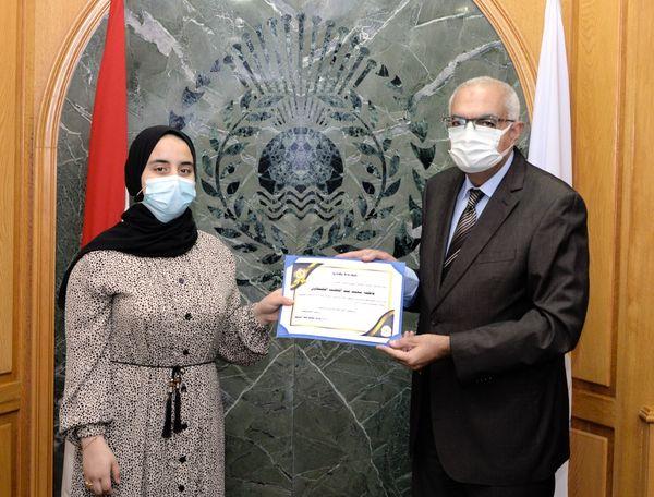 كرم أ.د أشرف عبد الباسط رئيس جامعة المنصورة اليوم الثلاثاء 24 أغسطس 2021 م الطالبة فاطمة محمد عبد اللطيف الطنطاوى الأولى على الثانوية العامة على مستوى الجمهورية شعبة علمي علوم بمجموع 404 من 410 درجة