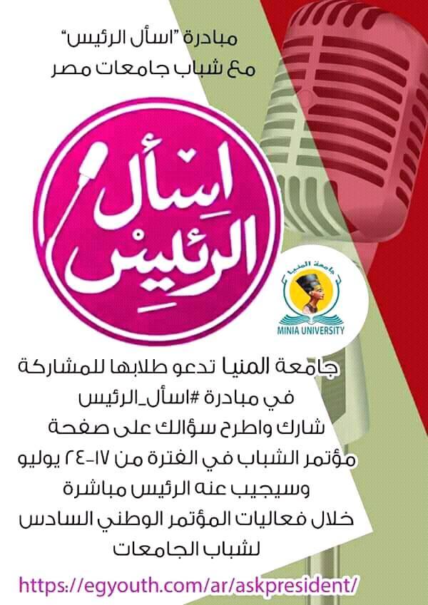 دعوة من رئيس جامعة المنيا جمال الدين على أبوالمجد بمشاركة شباب الجامعة فى مبادرة لشباب الجامعة بعنوان اسال الرئيس