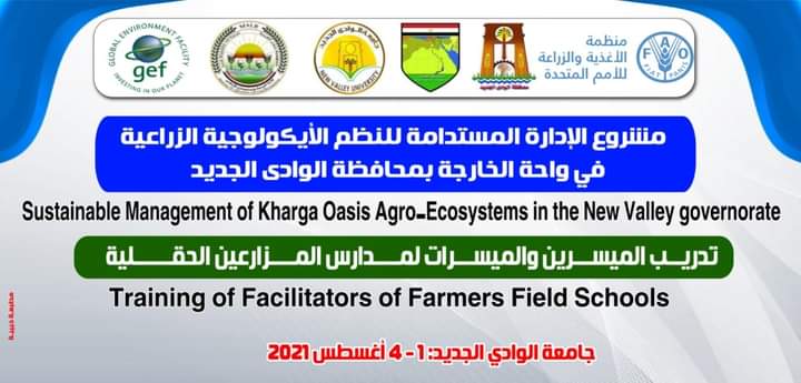 برعاية الاستاذ الدكتور عبد العزيز طنطاوى رئيس جامعة الوادى الجديد والدكتور نصر الدين حاج الأمين ممثل منظمة الاغذية الزراعة للأمم المتحدة في مصر ينظم مشروع "الإدارة المستدامة للنظم الأيكولوجية الزراعية لواحة الخارجة بمحافظة الوادي الجديد" برنامج تدريبي لإعداد الميسرين والميسرات لمدارس المزارعين الحقلية بمشاركة المهندسين الزراعيين والعاملين بالقطاع الزراعى والوحدات الزراعية بقرى الشركة والمنيرة وناصر الثورة والإدارة المركزية للمياه الجوفية والري