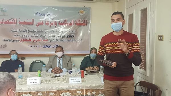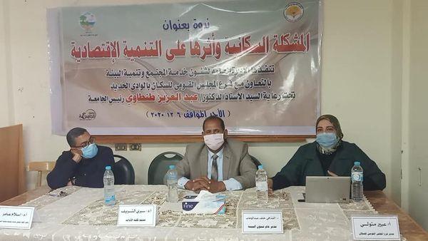 حيث نظمت الادارة ندوة بعنوان (المشكلة السكانية وأثرها على التنمية الاقتصادية) بكلية الاداب بالتعاون مع فرع المجلس القومي للسكان بحضور السادة أعضاء هيئة التدريس ومعاونيهم بالكلية والعاملين وطلاب الكلية وذلك في إطار التنسيق والتعاون بين فرع المجلس القومى للسكان بالوادى الجديد فى ظل الاجراءات الاحترازية التى تتخذها جامعة الوادى الجديد للوقاية من فيروس كورونا والالتزام بالتباعد الاجتماعى وارتداء الكمامة حفاظا على صحة وسلامة الطلاب والعاملين واعضاء هيئات التدريس