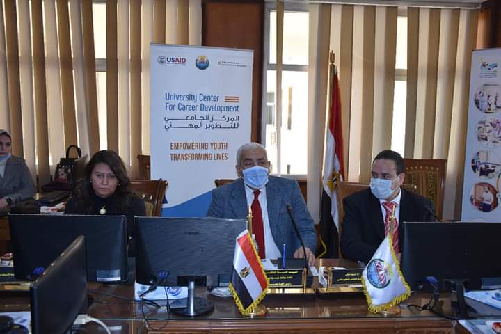 يأتي ذلك تحت رعاية الدكتور أحمد محمد بيومي رئيس الجامعة،والدكتور خالد محمد جعفر نائب رئيس الجامعة لشئون خدمة المجتمع وتنمية البيئة و الأستاذ الدكتور شريف محمد شوقي مدير المركز الجامعي للتطوير المهني بالجامعة، وبحضور ممثلين عن الجامعة الأمريكية بالقاهرة ومنظمة العمل الدولية وشركة جسر .