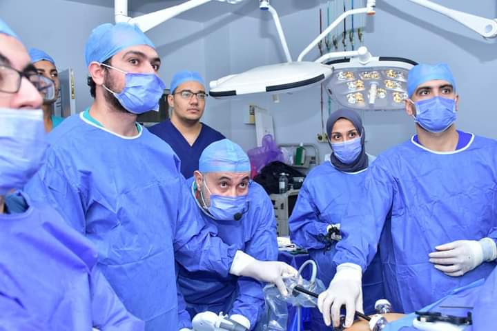 أد تامر نبيل أستاذ الجراحة العامة و المناظير ببني سويف و د عادل زيدان مدرس الجراحة العامة و المناظير ود محمود شعير مدرس مساعد الجراحة العامة و المناظير