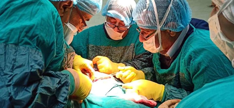 حيث قام الفريق الطبي بإجراء إستكشاف للبطن وعمل فحص ورد اﻷمعاء داخل تجويف البطن مع إستئصال أجزاء من منديل البطن ووضع درانق داخل تجويف البطن وأخري بالغشاء المبطن لعضلات البطن كما تم غلق جميع طبقات البطن مع تركيب حزام .