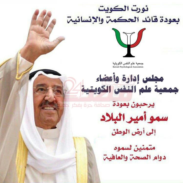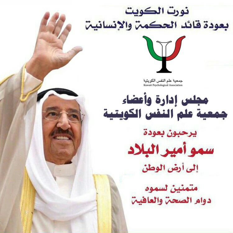 تتقدم جمعية علم النفس الكويتية بالتهنئة للشعب الكويتي بمناسبة عودة صاحب السمو الأمير الشيخ صباح الأحمد إلى البلاد بعد رحلة علاج في الولايات المتحدة الأمريكية تكللت ـ ولله الحمد ـ بالنجاح ، وابتهاجاً بهذه المناسبة .