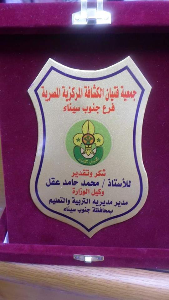 كلا من محمد عقل وكيل الوزارة ومصطفى الزغبى وكيل المديرية بدرع الجمعية حيث قام القائد أحمد أبو حسين مفوض مرحلة الجوالة بالجمعية بجنوب سيناء بتسليم الدرع نيابة عن القائد ربيع قرني محمد رئيس فرع جمعية فتيان الكشافة المركزية المصرية بجنوب سيناء .