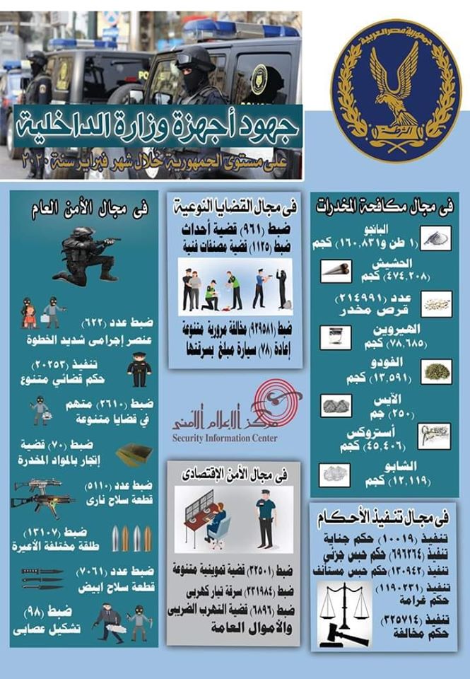 فى إطار إستراتيجية وزارة الداخلية الرامية إلى مواجهة كافة أشكال الخروج على القانون وضبط حائزى الأسلحة النارية ، ومكافحة جرائم الإتجار وترويج المواد المخدرة، وتنفيذ الأحكام القضائية وإستهداف التشكيلات والبؤر الإجرامية ومواجهة الأنشطة غير المشروعة التى تؤثر على الإقتصاد القومى للبلاد.. فقد واصلت أجهزة وزارة الداخلية على مستوى الجمهورية توجيه الحملات الأمنية كلُ فى مجال تخصصه تنسيقاً وقطاع الأمن المركزى ، أسفرت جهودها خلال شهر .. عن تحقيق النتائج الإيجابية التالية:-