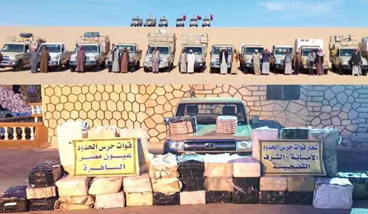 وفى إطار هذه الجهود كثفت قوات حرس الحدود دورياتها على كافة الإتجاهات الإستراتيجية لقطع خطوط التهريب وإحباط مخططات الخارجين عن القانون حيث تمكنت من إحباط محاولة تهريب كميات كبيرة من الأقراص المخدرة و البضائع غير خالصة الرسوم الجمركية ، بمنطقتى بحر الرمال الأعظم وعين دالة وجنوب منفذ السلوم حيث تم ضبط 14 سيارة دفع رباعى بدون لوحات معدنية محمل عليها 600 كرتونة تضم عدد 30 ألف قاروصة سجائر مسرطنة أنواع مختلفة وعدد 155 كرتونة تبغ وعدد 2 مليون قرص مخدر وتم القبض على 20 فرد مصرى الجنسية .