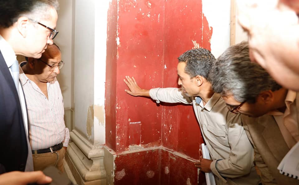 و خلال الجولة وجه د. العناني و أعضاء لجنة التقييم الي الشركة المنفذة للأعمال بعض الإرشادات لوصول الدهانات الخاصة بالحوائط و الأسقف الي درجة اللون الأصلي بالضبط كما هو مدون في تصميمات المعماري الفرنسي.