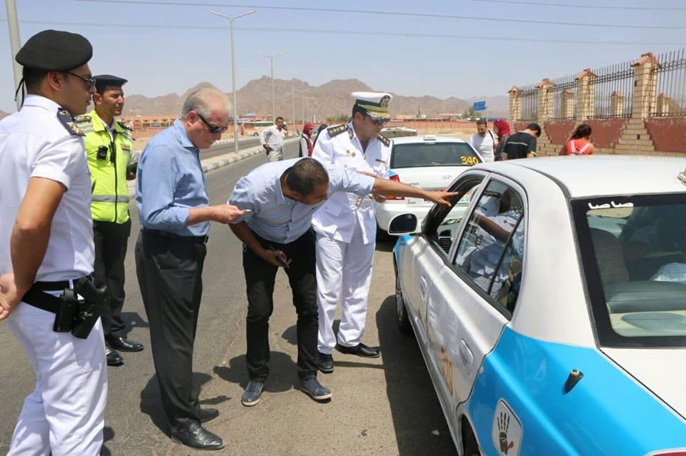 جولة مفاجئة لمحافظ جنوب سيناء بموقف شرم الشيخ لمتابعة تنفيذ التعريفة الجديدة شدد اللواء خالد فوده، محافظ جنوب سيناء، علي الالتزام بالتعريفة الجديدة وحظر السائقين من أي استغلال للركاب وتأكد من تعليق التعريفة داخل سيارات التاكسي والسر فيس باللغات الثلاث العربية والانجليزية والروسية نظرا لطبيعة شرم الشيخ السياحية. كما التقي المحافظ ببعض الركاب والزائرين للمدينة للاستفسار عن أرائهم ومعرفة أية شكاوي أو أي محاولات لمخالفة الأسعار ولا توجد أية شكاوي سواء من المواطنين أو سائقي سيارات التاكسي والسر فيس . جاء ذلك خلال الجولة المفاجئة التي قام بها محافظ جنوب سيناء صباح اليوم الخميس بمواقف مدينة شرم الشيخ لمتابعة تنفيذ تعريفة الركوب الجديدة . رافق المحافظ خلال جولته مدير إدارة مرور جنوب سيناء، وسكرتير مدينة شرم الشيخ ومدير إدارة المواقف بشرم الشيخ.