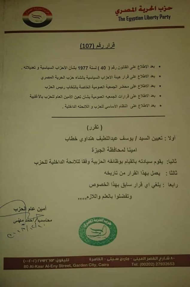 أصدر السيد المحاسب احمد مهني رئيس حزب الحرية المصري