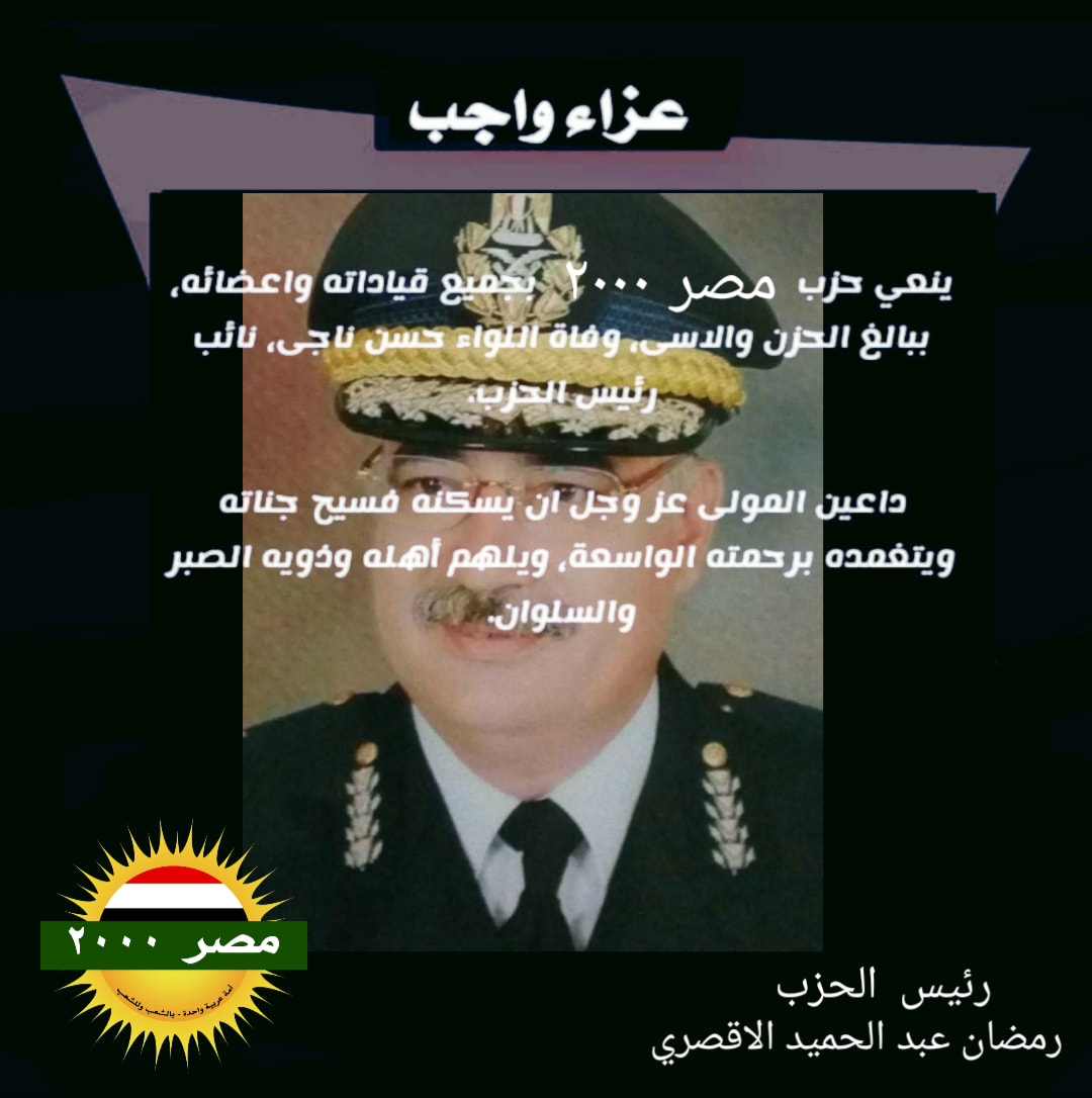 ينعى المستشار رمضان الأقصري رئيس حزب مصر 2000، وكافة قيادات وأمناء الحزب على مستوى وفاة اللواء حسن ناجى مساعد وزير الداخليه السابق ونائب رئيس حزب الحرية المصرى، والذي وافته المنية مساء اليوم بمحافظة السويس.