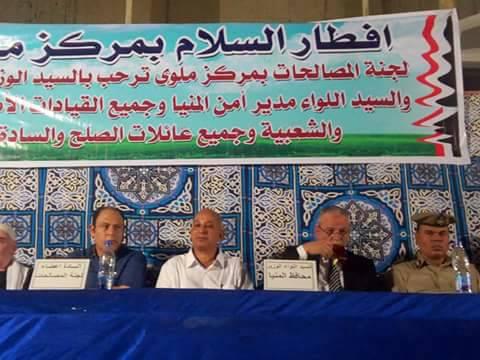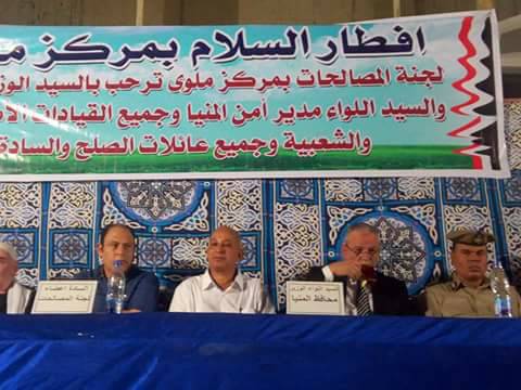 كتب:ممدوح السنبسي في سابقه هي الاولى من نوعها و برعايه السيد اللواء محافظ المنيا و لجنة المصالحات العرفية بمحافظه المنيا و الاجهزه الامنيه بمركز ملوي وحده مباحث ملوى شارك اللواء عصام البديوي محافظ المنيا حفل افطار جماعى لاكثر من 300 شخص يمثلون 35 عائله بمركز ملوي جنوب المنيا الذي تم التصالح بينهم في خصومات ثأريه وكان هذا الأفطار تحت شعار أفطار السلام الذي اقيم في نادي العائلات في مدينه ملوي بحضور السيد محمود عبد المعطي القائم بأعمال رئيس مركز ومدينه ملوي و الساده نواب المركز والمدينة السيد عامر طه أدم و السيد محمد عبد الغني نائبا مركز ومدينه ملوي و الساده رؤساء القرى التسع و الساده رؤساء الاحياء و بحضور الساده نواب البرلمان المصري بمركز ومدينة ملوى و بحضور القيادات الامنيه متمثله في السيد العميد منتصر عويضه مدير اداره البحث الجنائي و السيد العميد علاء الجاحر رئيس مباحث المديريه والسيد العميد عصام جمال مامور مركز ملوي و السيد العميد عصام ابو الفضل رئيس فرع البحث الجنائي بالجنوب والسيد العقيد علاء جلال رئيس مباحث مركز ملوى والذى ساهم مساهمة كبيرة فى انهاء الخصومات الثأرية ويعد هذا الأفطار الأول نوعه ويهدف لتوطيد قيم السلام والمحبه والاخوه ونبذ العنف وأكد البديوي في تصريحات صحفية لسيادته ان هذا الافطار ما هو الا رساله لنبذ العنف و السعي للسلام وانهاء الخصومات الثأرية وأضاف محمود عبدالمعطي القائم بأعمال رئيس مركز ومدينة ملوى بأن هذا الأفطار جاء من منطلق القضاء على اى خصومات ثأرية والسعى خلف مظلة السيد اللواء محافظ المنيا التى عنوانها الرئيسى نعم للسلام لا الخصومات الثأرية