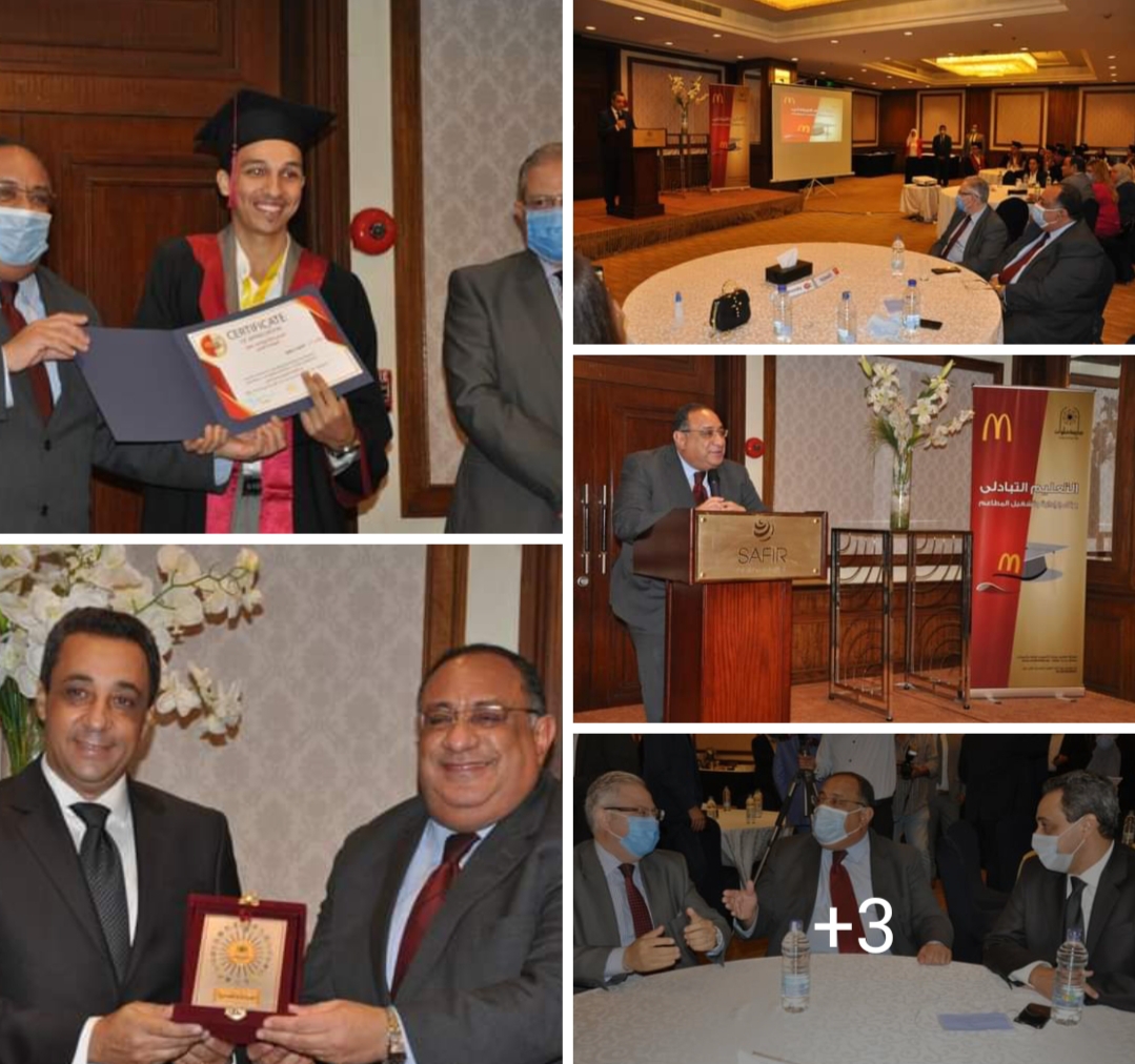 وفي ختام الحفل قام رئيس جامعة حلوان بتسليم الطلاب شهادات التخرج، كما تبادل الدروع التذكارية مع الأستاذ علاء فتحي مدير عام شركة مانفودز ماكدونالدز مصر.