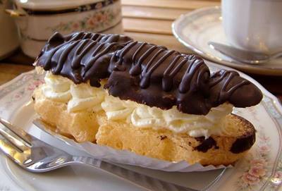 نصف لتر ماء – 200 جرام زبدة – 300 جرام دقيق – 6بيضات – 1 ملعقة صغيرة فانليا – ملعقة سكر – رشة ملح الطريقة يرفع اناء على النار به نصف لتر ماء ويضاف له 200 جرام زبدة وملعقة سكر ورشة ملح ويقلب حتى الغليان ثم نضيف 300 جرام دقيق مع التقليب المستمر لمددة 3 دقائق ثم ترفع من النار وتترك حتى تبرد ثم يوضع البيض واحدة تلو الاخرى مع التقليب المستمر ونضيف الفانليا حتى ينتهى عدد البيض وتتجانس العجينة تماما ثم توضع في كيس حلواني وتقطع الى اصابع متساوية في صينية وتوضع في فرن درجة حرارة 170درجة حتى تأخذ اللون الذهبى وتترك حتى تبرد وتفتح بالسكين وتحشى بالكسترد وتزين بالشوكلاتة