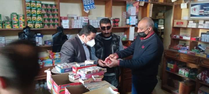 والتحفظ علي ٦٣ علبه سجائر مجهوله المصدر و عدد ٦٣ عدد زجاجه مشروبات غازية و ١٠٨ باكت مجهوله المصدر وأعدام كميه ٥٠٠ كجم اغذيه متغيره في خواصها الطبيعيه في حمله مكبره بمركز ومدينه المطريه .