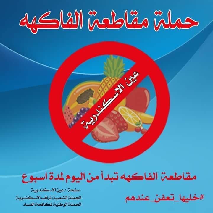 اطلقت صفحة عين الاسكندرية لمقاطعة الفاكهة بعد غلو أسعارها بطر يقة بشعة حيث صرح المهندس أحمد الغمري أحد الداعمين للمقاطعة أن 100 جنيه أصبحت لا تكفي أي مواطن سكندري لشراء فاكهة الموسم وهذا يرجع لجشع التجار فالمزارع لا ذنب له بل التاجر يقوم بمضاعفة السعر اضعاف مايدفعه من ثمن بخس للمزارع والمقاطعة ستستمر من أول سبتمبر ولمدة أسبوع كامل