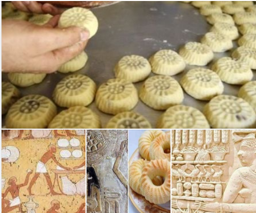 ويضيف الدكتور ريحان أن جدران المعابد والمقابر منذ عصر الدولة القديمة تزينت بمناظر النساء يقمن بعجن العجين وصبه على هيئة قرص الشمس المستدير المزين بخطوط مستقيمة مثل أشعة الشمس وكانوا يصنعون عدة أشكال اللولبي والمخروطى والمستطيل والمستدير ويستخدمون العسل الأبيض في صنعه لإهدائه إلى المعابد كقرابين في الأعياد