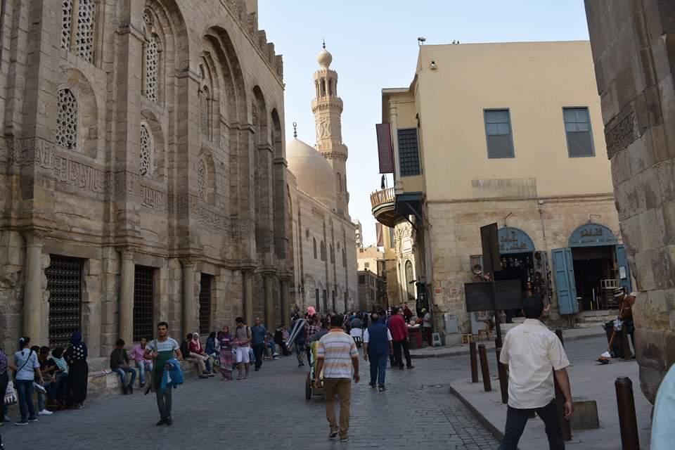 وتابع بأن الشارع وكل القاهرة التاريخية تواجه عدة تحديات وهى تداخل الآثار مع الورش والحرف التراثية والمساكن والمطاعم والإشغالات المختلفة التى تهدد آثار هذا الشارع من وجود أنابيب بوتجاز بالمطاعم ومخازن للبضائع وأسقف خشبية عليها مواد مخزّنة لبعض المحلات علاوة على المنازل السكنية بالشارع وكل هذا يهدد بحدوث حرائق تهدد آثار الشارع بأكمله والإشغالات المختلفة تشوه الشكل الجمالى وتقضى على جماليات الرؤية البصرية السياحية للشارع رغم كل ما حدث به من تطوير