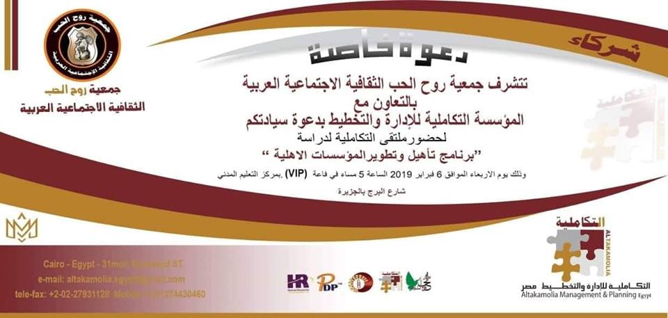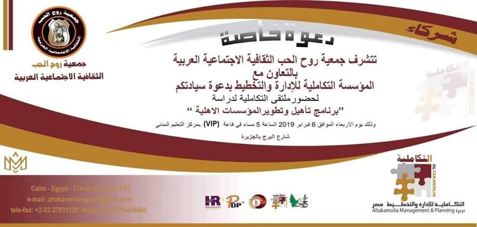 جمعية روح الحب الثقافية الاجتماعية العربية بالتعاون مع المؤسسة التكاملية لادارة والتخطيط بدعوة سيادتكم لحضور ملتقى التكاملية للدراسة ((( برنامج تأهيل وتطوير المؤسسات والجمعيات الأهلية))) وذلك يوم الاربعاء الموافق 6 فبراير الساعه الخامسة مساءاا فى قاعة VIPبمركز التعليم المدنى بالجزيرة ))) شارع البرج بالجزيرة مع مرعاة حين الموافقة بالحضور اخطارنا مسبقا مع اعطائنا شعار الجمعية او المؤسسة لوضعه فى البانر المخصص لذلك