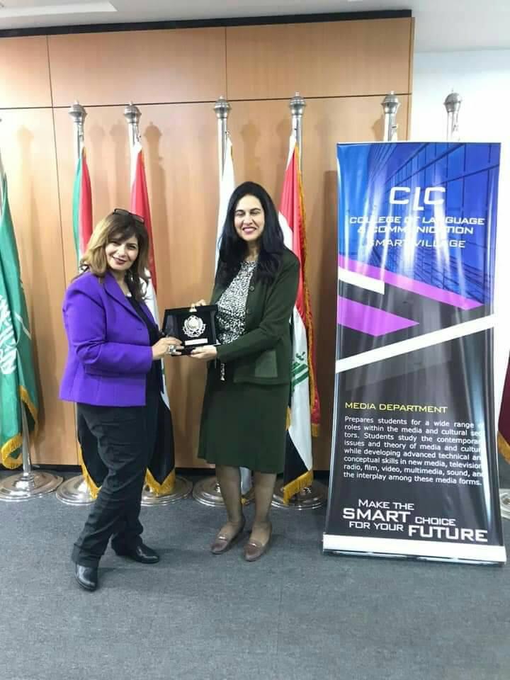 وفي نهاية اللقاء قامت الأستاذة الدكتورة حنان يوسف، أستاذ الإعلام بجامعة عين شمس، عميد الكلية بتكريم السفيرة سامية ببيرس ومنحها درع اﻻكاديمية تقدير ا لجهودها .