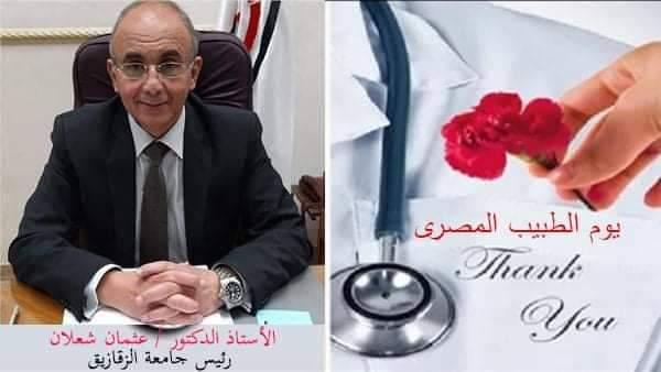 تتقدم أسرة جامعة الزقازيق برئاسة د.عثمان شعلان رئيس الجامعة ، بالتهنئة لجميع أطباء مصر عامة، وأطباء محافظة الشرقية ومستشفيات جامعة الزقازيق خاصة ، بمناسبة الإحتفال بيوم الطبيب المصري، والذي يوافق ١٨ مارس من كل عام، وذلك تزامنًا مع ذكري إفتتاح أول مدرسة للطب في مصر والشرق الاوسط بأبي زعبل في ١٨ مارس عام ١٨٢٧م .