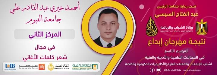 تحت رعاية فخامة الرئيس عبد الفتاح السيسي، رئيس الجمهورية، يتقدم الأستاذ الدكتور محمد سعيد أبو الغار، القائم بأعمال رئيس جامعة الفيوم، بخالص التهنئة للطالب محمد أحمد حسين حسن الوكيل، والذي حصل على لقب (الطالب المتميز) في مجال الدوري الثقافي، والطالب أحمد خيري عبد القادر علي، لحصوله على المركز الثاني في مجال شعر كلمات الأغاني وذلك في مهرجان إبداع (الموسم التاسع).