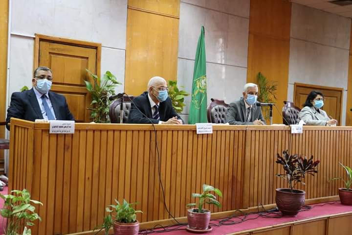 وأحاط مبارك الحضور بكتاب المجلس الأعلي للجامعات المتضمن على التأكد من وجود الكوادر الطبية المدربة والكافية بالأماكن المخصصة للتعامل مع حالات الكورونا، الحد من التجمعات أو الإجتماعات أو الاحتفالات، وتأجيل المهرجانات العامة والجماهيرية حتي استقرار الأزمة، الإلتزام بمعايير الوقاية للأفراد والأماكن والمكاتب، هذا وقد قرر رئيس الجامعة عدم إقامة احتفال بعيد الجامعة لهذا العام حفاظا على السلامة والصحة العامة واتخاذ كافة الإجراءات الوقائية والإحترازية اللازمة، والترتيب مع الكليات ليتم توزيع شهادات التقدير والجوائز التى كان سيتم تسليمها للمكرمين بالحفل بكل كلية ويقوم العميد بتسليمها لهم، كما يتم تجهيز فيلم تسجيلى موثق لانجازات الجامعة خلال عام.