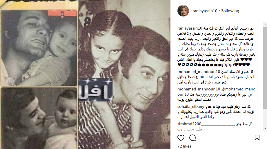 وعلقت رانيا ياسين على الصور، "أبى وحبيبى الغالي أبي الذي عرفت معه الحب والعطاء والتفاني والكرم والحنان والصدق والاخلاص عرفت منك كل قيم الحق والخير والجمال ربنا يديك الصحة والعافية كل سنة وأنت بخير وصحة وسعادة ربنا يخليك لينا يارب ويبارك فيك يا حبيبي ويحفظك ودايما حسك في الدنيا بخير وصحة يارب كل سنة وأنت طيب وعقبال مليون سنة يا قلبي الكلام فيك ما يخلصش بحبك يا أغلى الناس".