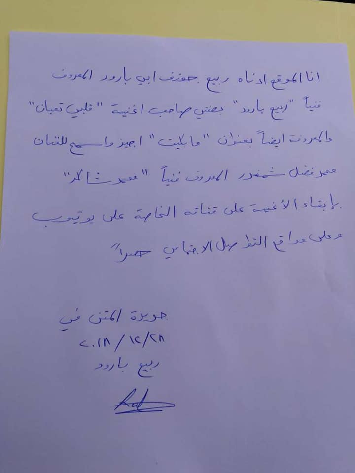 وبعد فترة، قام ربيع بارود بدافع المحبة وحسن النية، بكتابة ورقة سماح فني للفنان محمد شاكر، بأن يقوم بغناء الأغنية، مع الإحتفاظ بوجود إسم ربيع بارود لأنه المالك الأصلي لها.