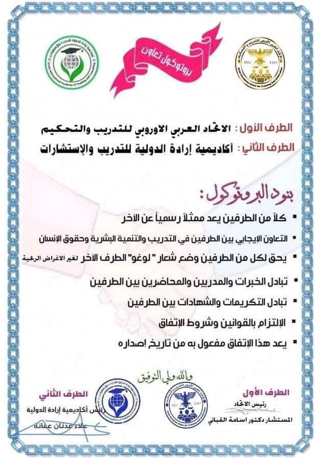 وقع الاتحاد العربي الاوروبي للتدريب والتحكيم، برئاسة المشتشار الدكتوراسامة القباني، بروتوكول تعاون مع أكادمية إرادة الولية للتدريب والاستشارات، وذلك لتبادل الخبرات فيما بينهم.