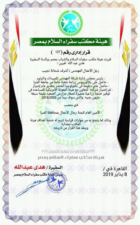 اصدرت السفيرة هدى عبد الله رئيس هيئة مكتب سفراء السﻻم والشباب بمصر قرار اداري ﺑﺘﻌﻴﻴﻦ ﺭﺟﻞ ﺍﻷﻋﻤﺎﻝ ﺍﻟﻤﻬﻨﺪﺱ ﺃﺷﺮﻑ ﺷﺤﺎﺗﺔ ﻧﺠﻴﺐ ﺭﺋﻴﺲ ﻣﺠﻠﺲ ﺇﺩﺍﺭﺓ ﺷﺮﻛﺔ ﺍﻟﻤﻬﻨﺪﺱ ﻟﻠﻤﺒﻴﺪﺍﺕ ﻭﺍﻟﺒﺬﻭﺭ ﻓﻲ ﻣﻨﺼﺐ ﺍﻷﻣﻴﻦ ﺍﻟﻌﺎﻡ ﻟﻠﺠﻨﺔ ﺭﺟﺎﻝ ﺍﻷﻋﻤﺎﻝ ﺑﻤﺤﺎﻓﻈﺔ ﺍﻟﻤﻨﻴﺎ